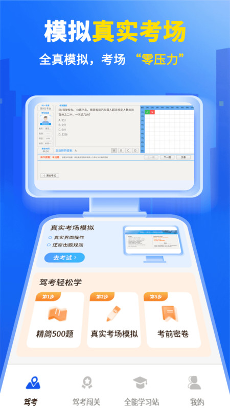 1、进入首页,可以直观了解科一到科四的全部驾考题目。
