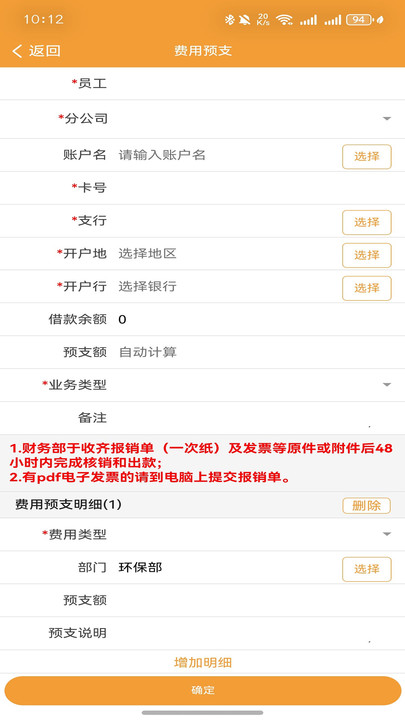 3、进入到个【费用预支】,可以线上填写详细的信息进行申请。