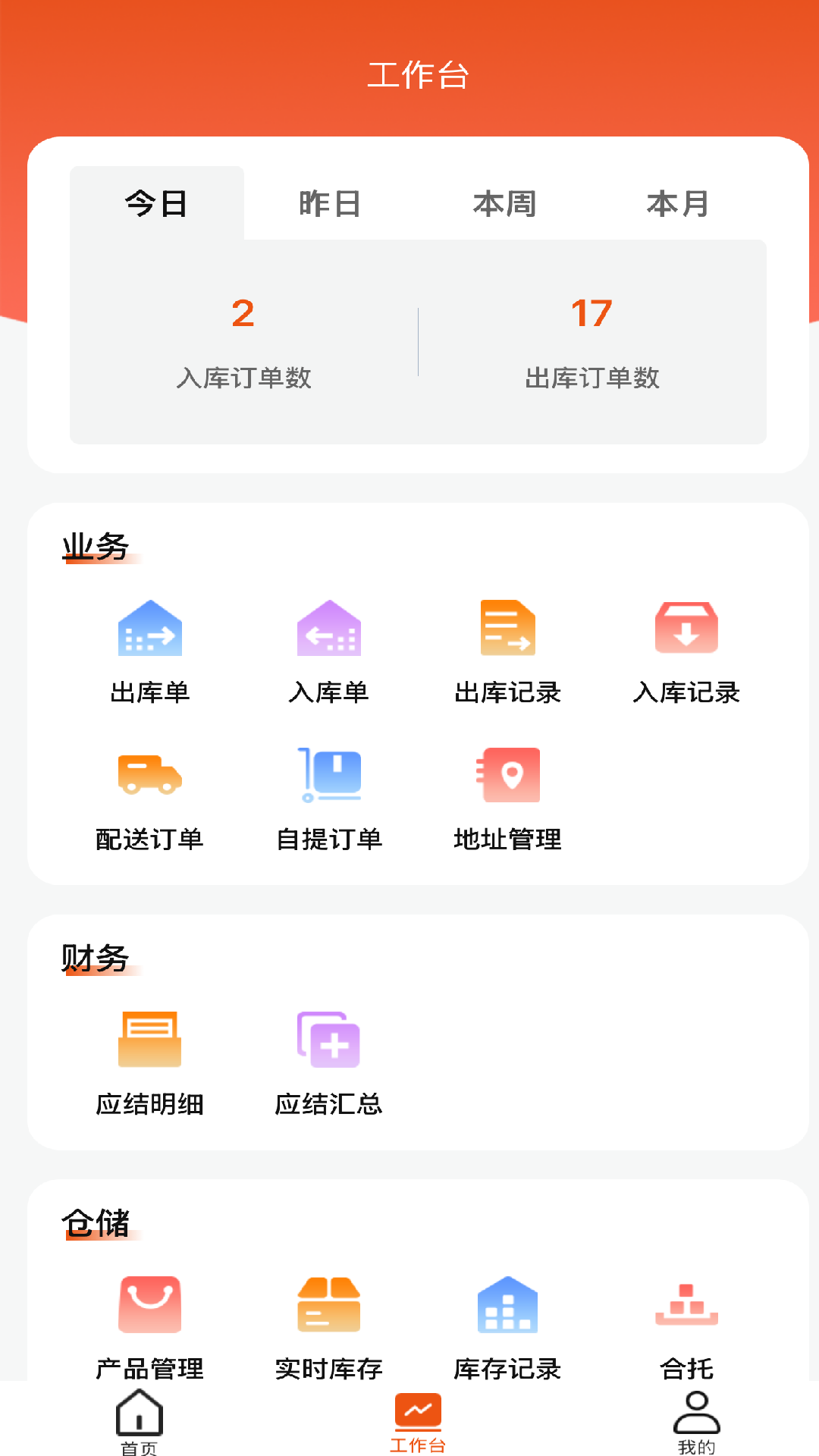 2、进入首页可以看到丰富的功能,日常仓管都是更加轻松。