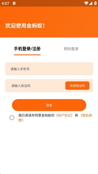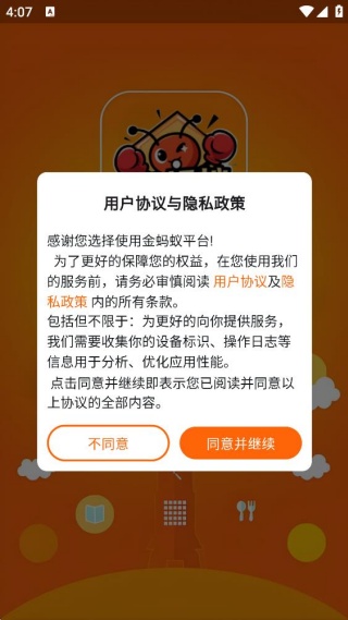 1、在应用商店轻松下载安装金蚂蚁app,仔细查看用户协议内容后点击同意按钮。