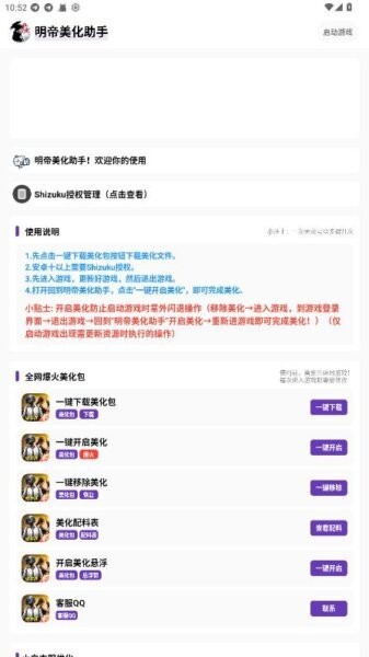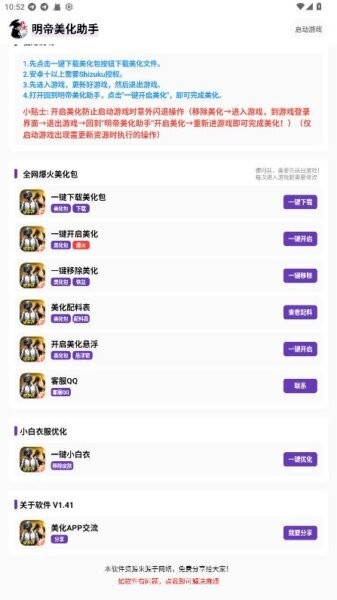 明帝美化助手最新版本是一款全能型的美化工具,app打造多样化的皮肤道具、一键式操作设计,成功满足了用户的多样化需求。无论是游戏装扮、页面优化,还是个性化风格定制,这款工具都能为用户提供高效且便捷的支持。这款工具提供了详尽的操作说明和使用指南。不管是新手还是资深用户,都能通过这些资料快速掌握各项功能的使用方法。App还内置了便捷的分享功能,用户可以将自己的美化成果轻松分享到社交平台或与好友互动,进一步提升了这款工具的实用性和趣味性。