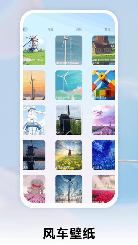4、来到软件壁纸页面可查看风车、动漫、风景等类型的精美壁纸。