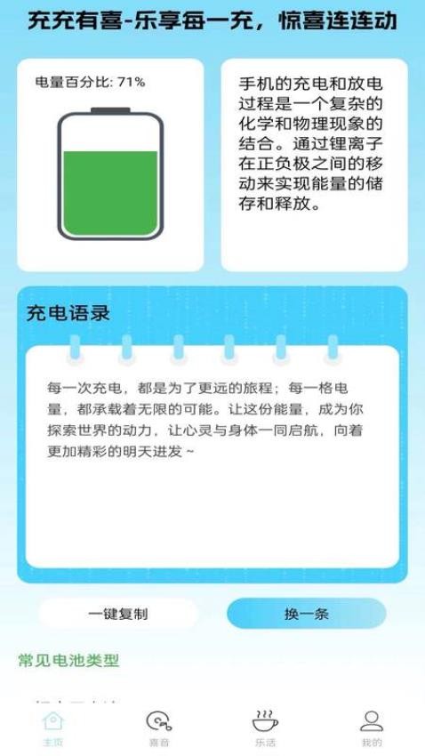 2、进入首页,有充电语录和常见电池类型等内容,可以一键复制。