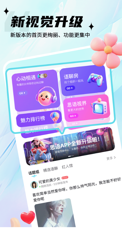 思语app是一款属于年轻人的线上聊天交友软件,异性在线聊天方便简单,不仅仅可以让你随时发现感兴趣的异性朋友,你也可以及时来这扩大你的人脉圈,让你交友不再局限于身边,你也可以放开眼界随时去认识更多不同地区的人,合适的话就可以关注起来,不合适的话就可以直接划走,在线聊天也可以直奔主题,提高聊天效率。