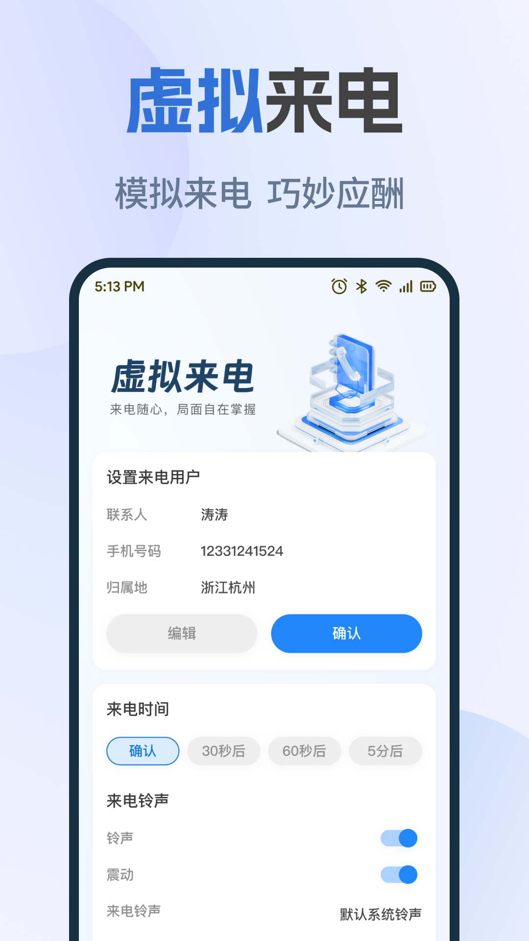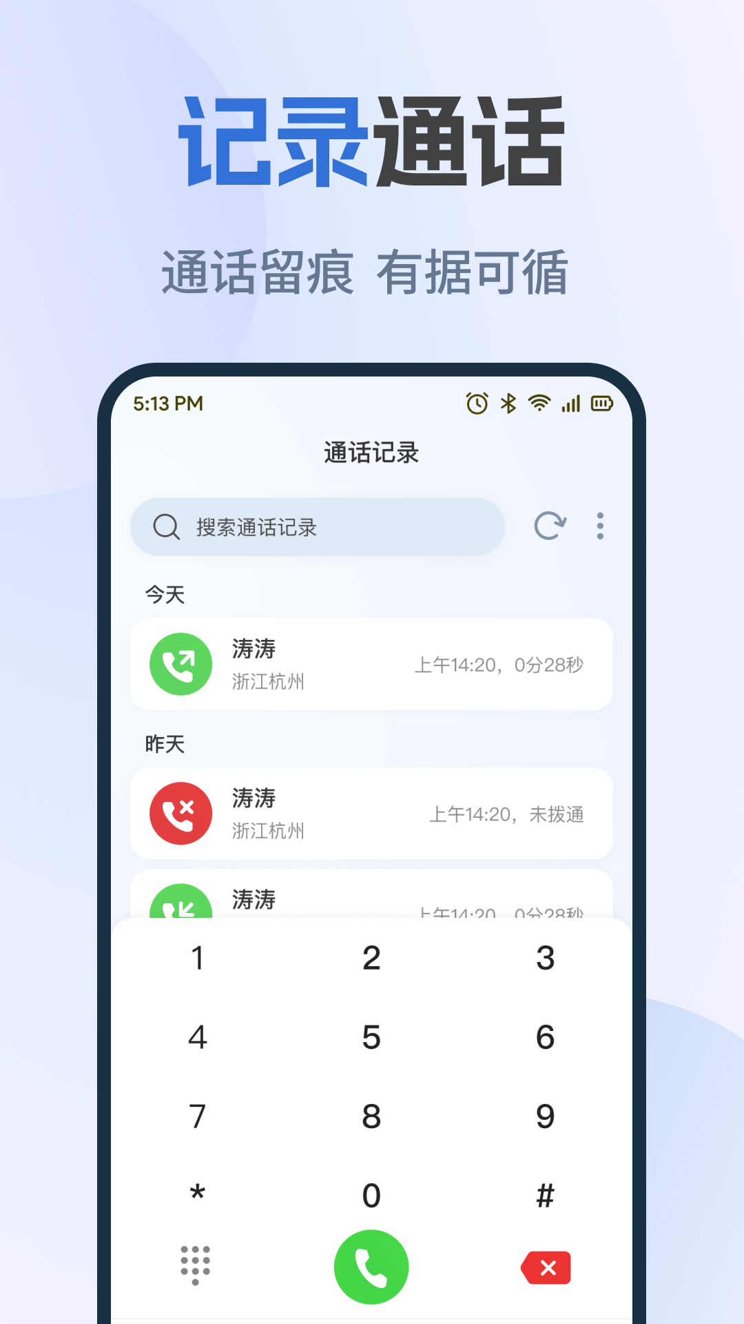 手机通话记录快查app自定义来电人、归属地与响铃时间,一键触发真实来电界面,饭局脱身、面试缓场都能优雅应对,长按图标即可弹出搜索框,输入号码直接跳转到对应记录,省去先开App再点搜索的繁琐步骤,同一号码多次通话自动折叠为一条主记录,可展开查看明细,列表清爽不冗余,节省滑动时间,仅申请读取通话日志单项权限,拒绝通讯录、定位、存储等无关索取,最小化数据接触,安全可验证。