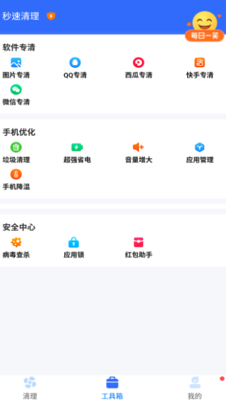 3、在工具箱功能中,提供了超多小工具,不管是手机清理还是优化都可一键执行。