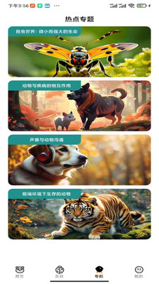 4、专题板块深度挖掘,针对特定动物或生态现象,提供详尽的背景介绍、趣味故事及科学解析,让您对动物世界有更全面的认识。