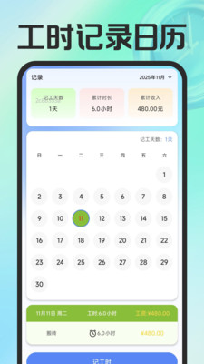 1、随时轻松记工时,设定工资,每月工时和收入都能一目了然;