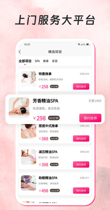 3、上线了中式推拿、肩颈专项调理、精油 SPA、泰式拉伸、热敷理疗等,用户可以自由选择。