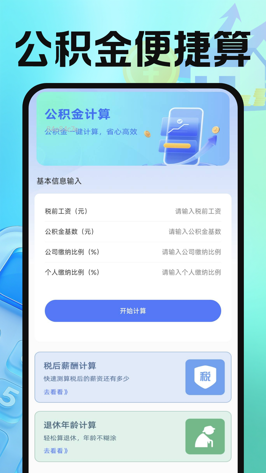 2、进入首页可以看到丰富的功能,点击下方的【开始计算】实时计算公积金。