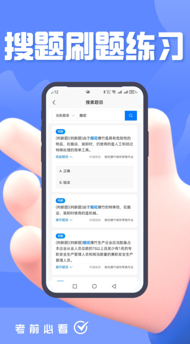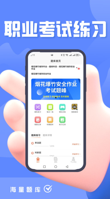 烟花爆竹安全作业考试题峰app是一款超级给力的烟花知识在线备考学习软件,在这备考方便简单,用户只需要有手机就可以尽情来这刷题,题库将会随时更新,历年的真题也都在这,帮助用户快速解决考试的问题,也可以让更多考生们来这查看最新的考试大纲,有针对性的复习更轻松,学习起来效率也会提高,随时开启你的学习计划吧。