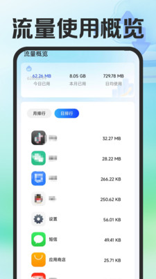 2、提供流量概览,可以了解手机应用消耗流量的情况;