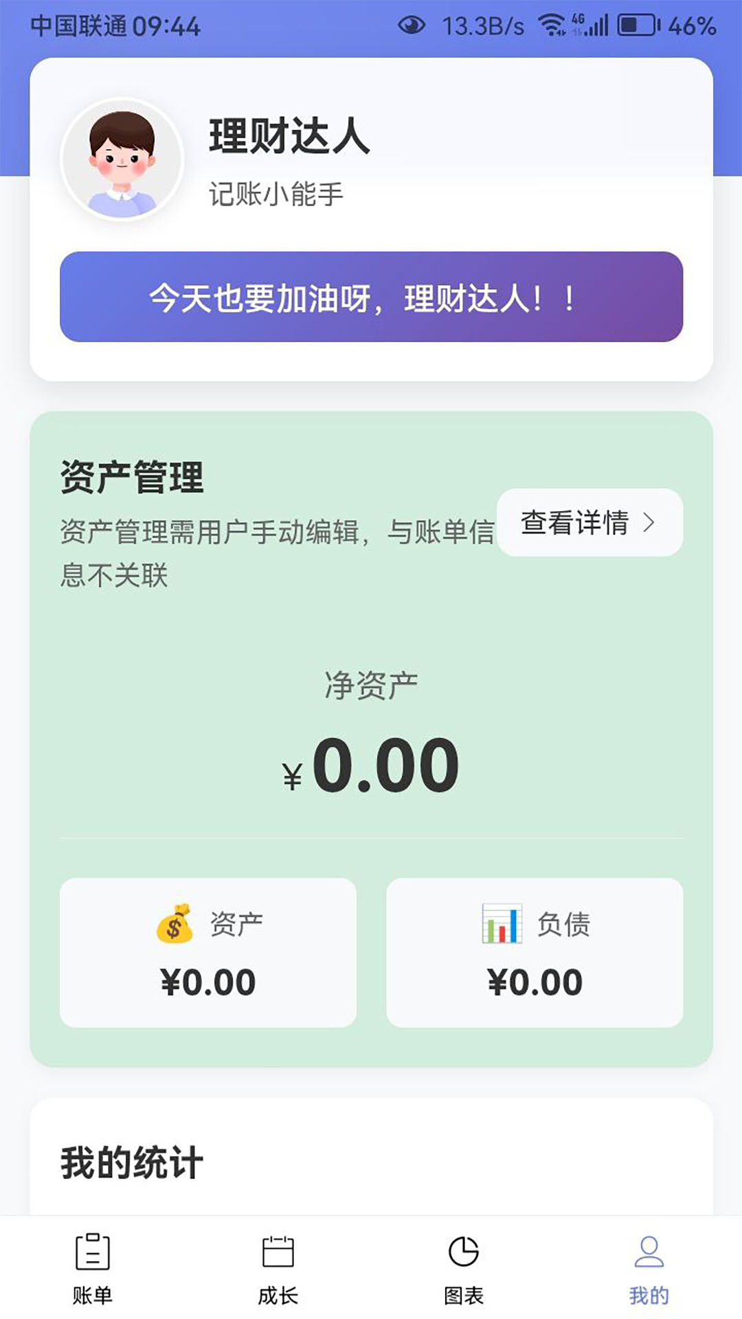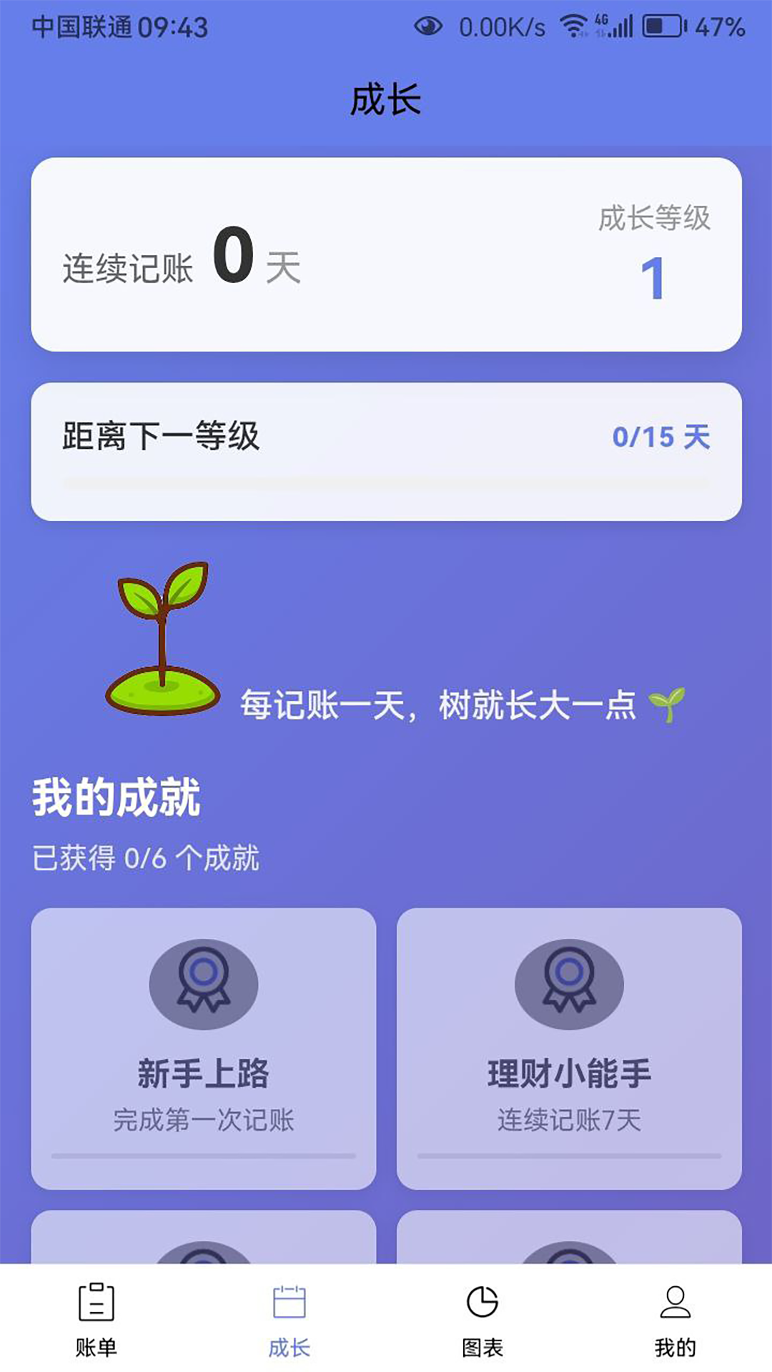 3、进入到【成长】,可以查看自己记账多少天,每日坚持打卡。