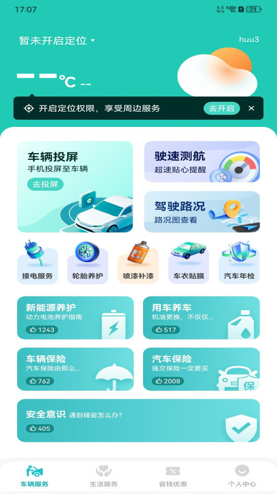 2、软件首页提供了日常的车辆服务,开启定位功能服务更全面。