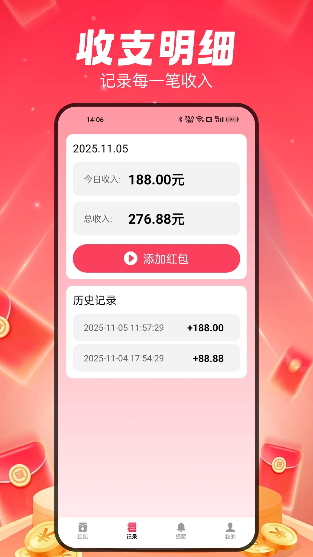 2、详细的收入记录与统计功能,让您的红包收支情况清晰透明,管理更加得心应手。