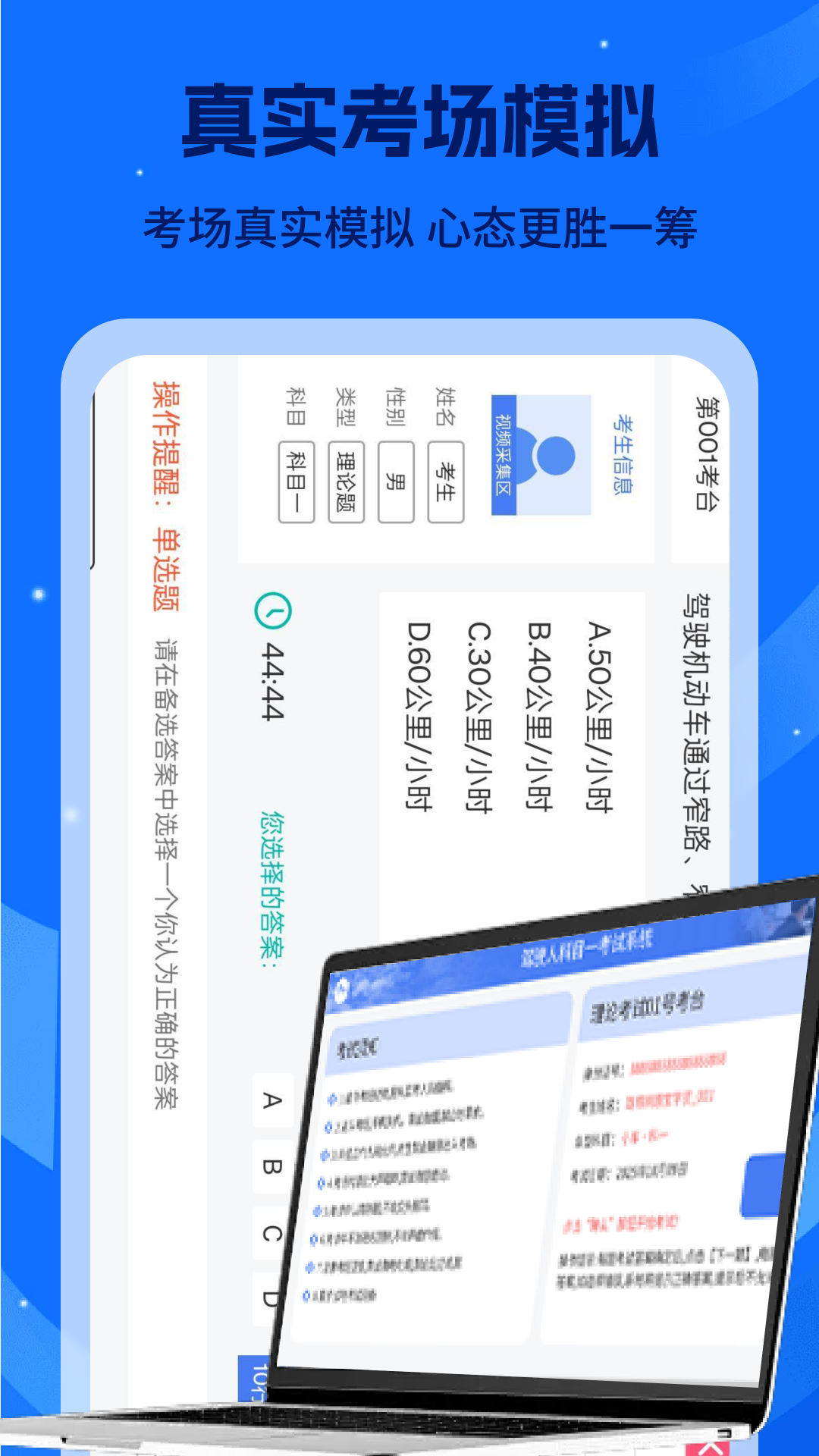 1、完全按照考试标准设置题目数量、考试时间和合格标准,提供逼真的考试体验。
