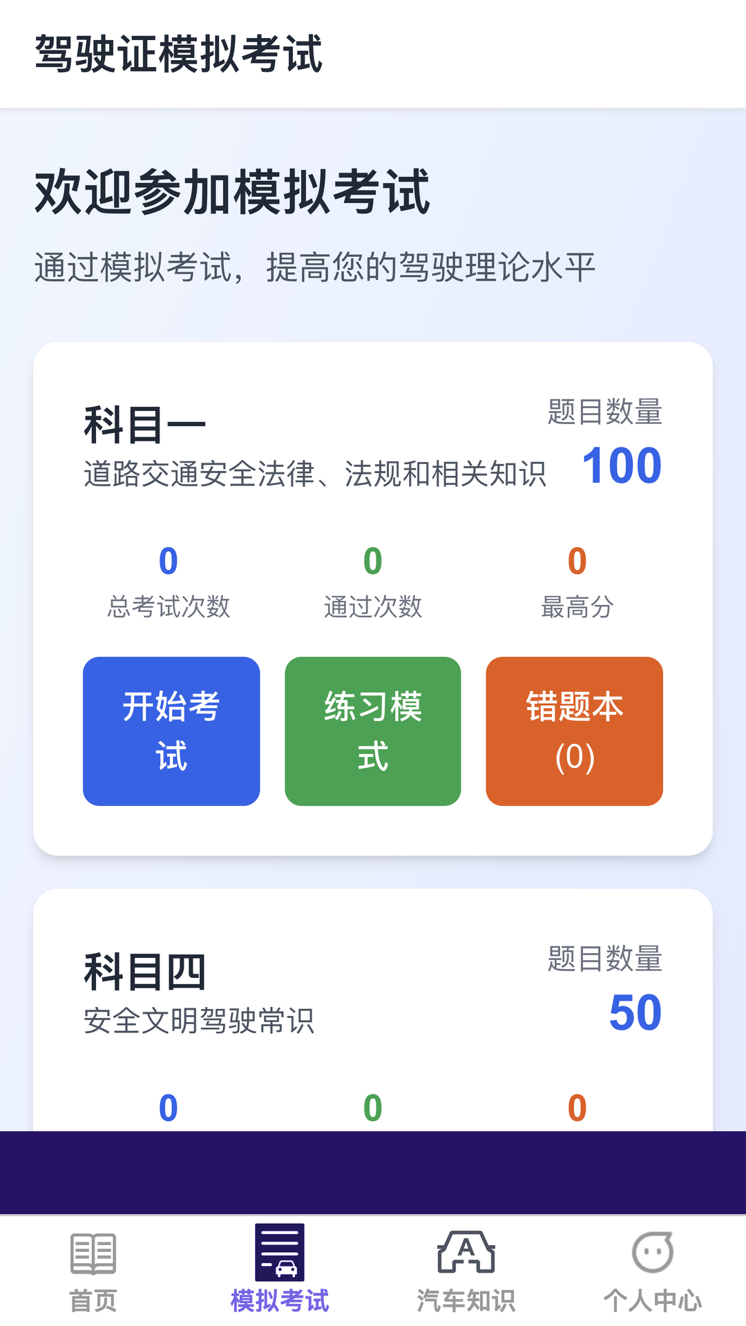 2、首页有科目一、科目二、科目三和科目四还有学习进度和考试技巧可以选择。