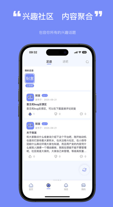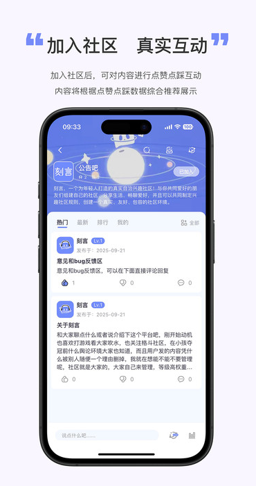 刻言app是一款年轻人比较喜欢的兴趣在线交友软件,在这汇集了各种不同兴趣的用户,有了它,你就可以快速寻找到你的组织了,加入了社区就可以参与社区的热门话题讨论,用户也可以对他人分享的话题进行点赞评论,并且也可以一键关注对方为好友,让你在线聊天方便简单,无需等待,大大提高你的聊天效率,交友之前不要忘记查看社区交友规则哦。