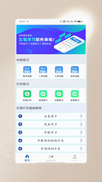 2、首页提供多维度训练模式,包含字根练习、词组强化与文章盲打。