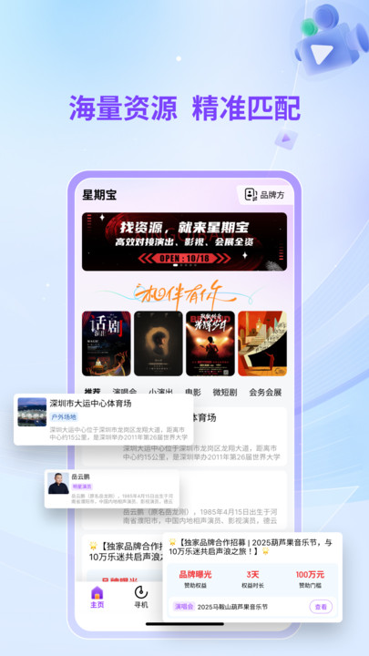 星期宝app是一款文娱活动领域的专业资源对接平台,汇聚了实力派艺人、专业模特团队、优质服务团队、特色活动场地及设备供应商等海量优质资源,通过智能算法实现供需双方的精准匹配。无论是大型文艺演出、商业会展,还是企业庆典、品牌发布会,app都能提供从资源筛选、方案策划到执行落地的全流程数字化管理服务。平台独创的智能推荐系统,可根据活动类型、规模预算、地域偏好等多维度需求,定制专属方案。