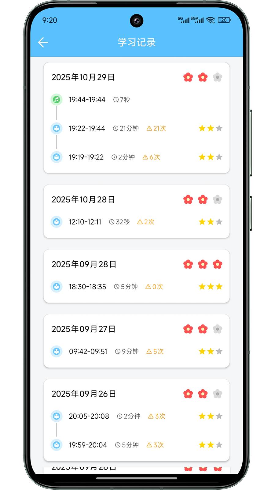 2、自动记录每日总专注学习时长、休息次数,并以图表形式展示专注力趋势变化。