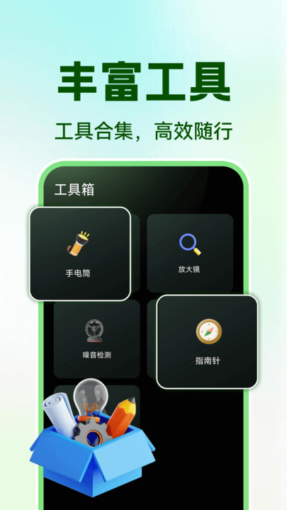 3、内置强光手电筒、数字放大镜、电子指南针等实用工具,满足日常应急使用需求。