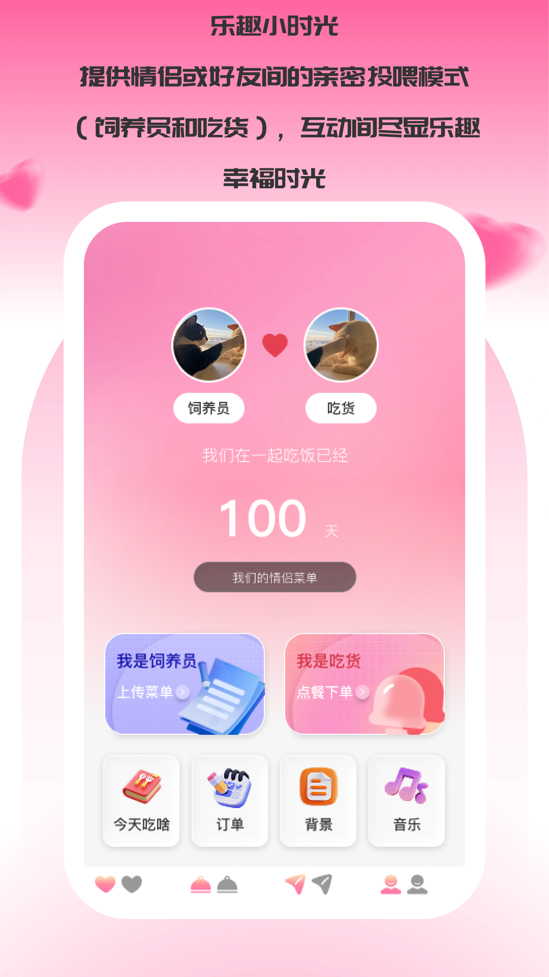 乐趣小时光app是一款专为亲密关系设计的美食互动软件,通过创意角色扮演让日常用餐充满仪式感。用户可以自由切换“吃货”与“饲养员”身份,吃货能轻松点选心仪美食,饲养员则可发挥创意设计专属菜单。这种趣味互动既满足了探索美食的期待,又增添了情感交流的乐趣,让每次用餐都成为彼此共享的温馨时刻。