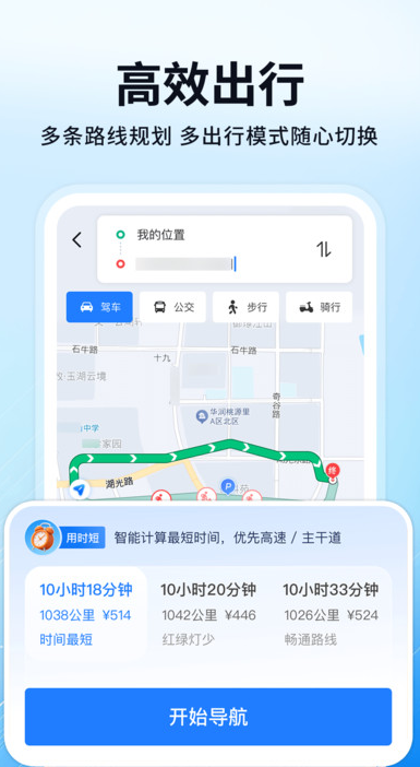 3、系统便会根据目的地生成最优路线,覆盖步行、驾车、骑行等多种出行方式。