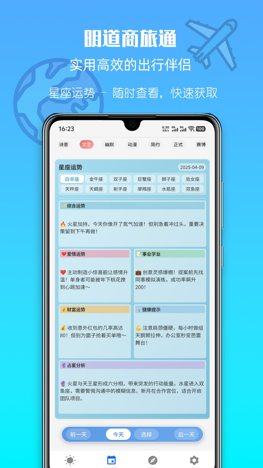 明道商旅通app是一款融合实用工具与生活指南的创新服务平台。软件将精准天气预告、传统黄历文化与星座运势解析巧妙结合,同时集成多种便捷小程序。无论是规划差旅行程、选择每日着装,还是获取生活决策参考,都能为用户提供贴心建议,让日常安排更从容,生活体验更富趣味。