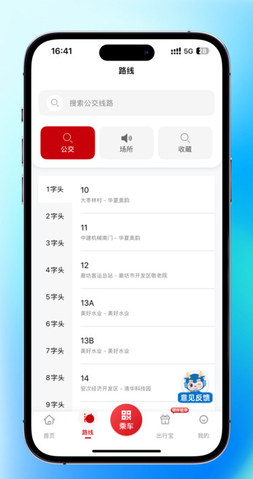 廊坊公交app是一款专为本地用户提供的公交出行服务软件,有了它,用户就可以随时来这查看公交的路线,并且也可以一键开启公交到站提醒功能,公交在线扫码功能也上线了,这样乘车公交就不需要备零钱了,只需要打开二维码一键扫码即可自动扣费,用户经常乘车的公交路线还可以一键在线收藏,方便可以随时关注公交的最新动态。