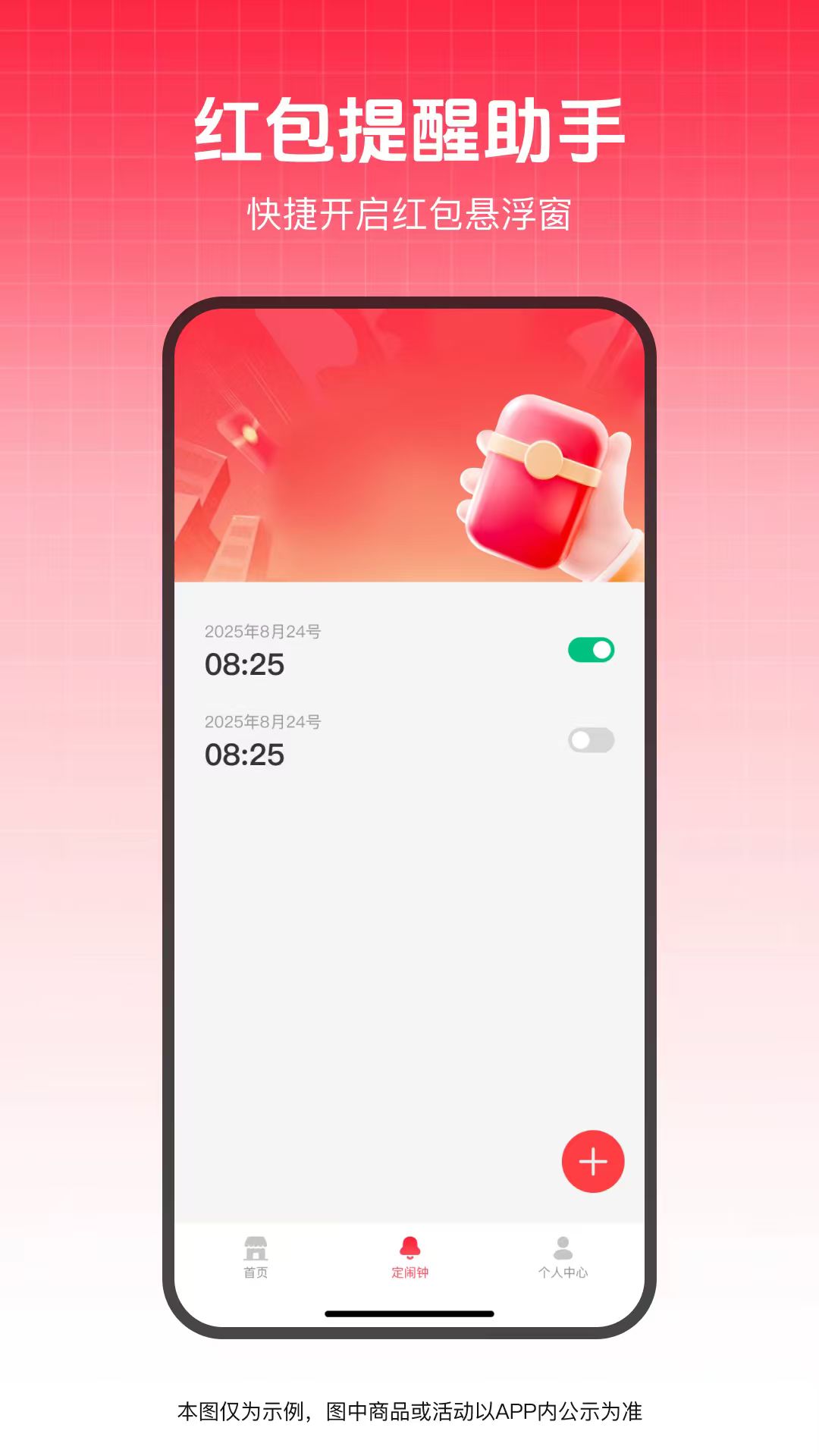 4、定闹钟板块,除了红包提醒外,还可设置日常闹钟,无论是起床、会议还是约会,都能准时提醒,让生活更加有序。