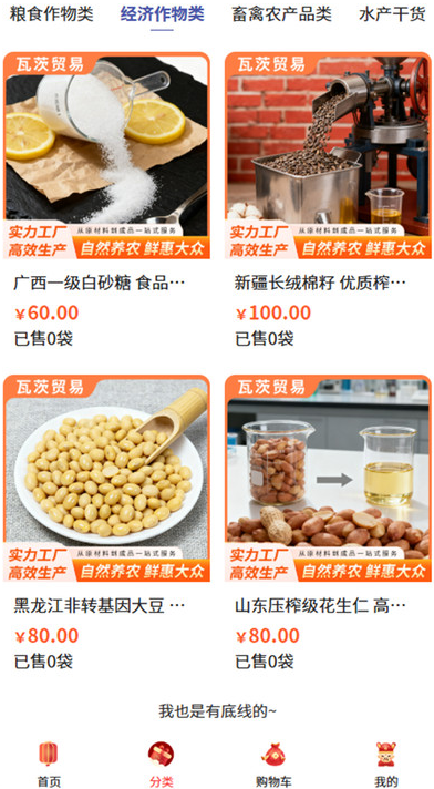 瓦茨贸易app是一款很不错的农产品在线交易软件,在这汇集了大量的农产品分类,很多农产品都是你没有见过的,更是没有吃过的,但是在这你都是可以轻松买到,购买之前你也可以及时和客服在线咨询,客服将会随时为你解答各种疑问,让你购买更方便,吃的更健康,无论是单买还是批发采购都是很不错的选择,商品价格实惠,下单快速为你安排发货到家。