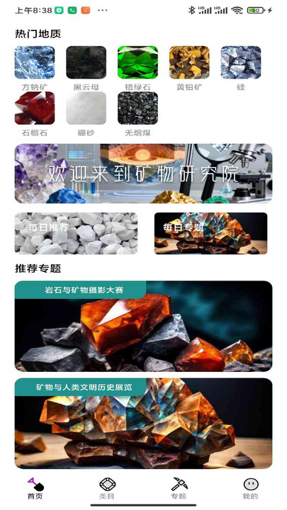 2、进入首页可以看到丰富的功能,一系列矿物知识都是可以看到。