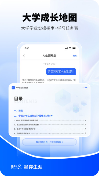 墨存生涯APP是一款专为艺术生打造的成长指导平台,聚焦艺术类学生的学业规划与职业发展。平台通过个性化评估,为每位用户量身定制阶段性学习计划,并提供专业导师一对一辅导。整合丰富的行业资源库,实时更新艺考资讯、求职机会与行业动态,结合在线评估工具追踪学习进度。社群互动功能促进经验分享,构建艺术生互助成长社区,系统化解决从学习到就业的全周期发展需求。