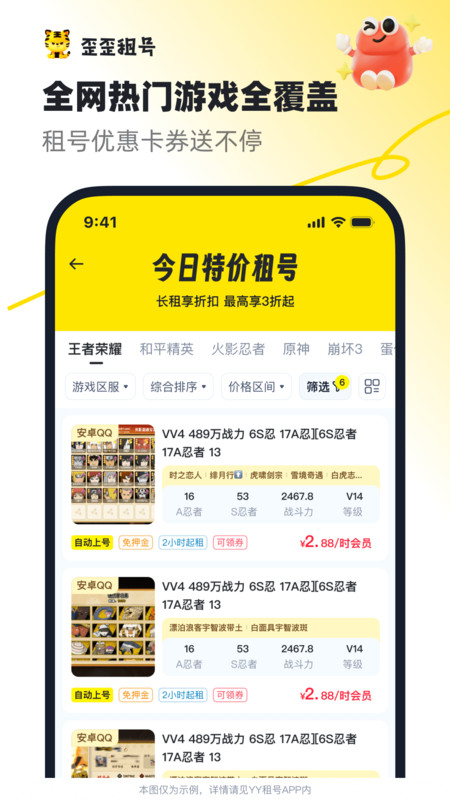 3、平台内置账号安全防护系统,采用加密登录、防顶号技术,同时提供租号保险服务,若因账号问题导致无法使用,可快速申请赔付,保障用户权益。