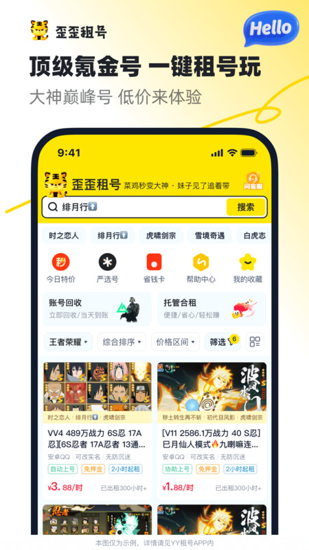 1、首页设置分类导航栏和精准搜索功能,用户可按游戏名称、价格区间、租期时长等条件筛选,30秒内即可定位目标账号,无需繁琐翻找。