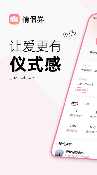 情侣券app是一款适合情侣们在线玩的甜蜜互动应用,在这用户可以随时根据你的个人需求一键创建你需要的劵,如夸夸劵,认错劵,双方纪恋日劵等,用户可以随时把劵给你的情侣进行分享,情侣也将会根据你的表现对你的劵进行评分,如果或者评分比较高那么就是对你的劵比较满意,让你每一次兑换券都是有惊喜等着你。