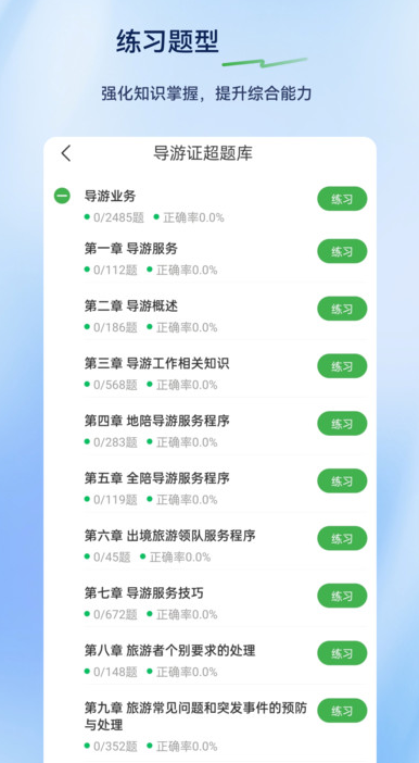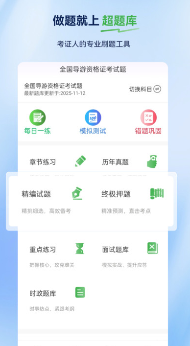 导游证超题库app是一款汇集了历年真题的备考学习软件,想要考导游证的考生们可以随时进入题库中心,随时来这一键刷题,在线学习不需要等待,任你及时查看最新的考试大纲,也可以及时来这查看热门考试资讯,最关键的是还可以进入模拟题库中心快速模拟刷题,系统将会快速为你进行评分,这样也可以让你及时掌握自己的复习程度,可以更好的有针对性在线学习。