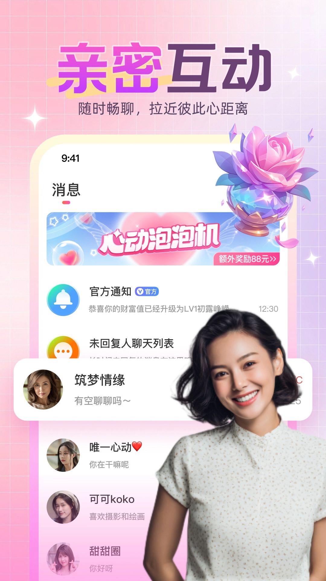 2、提供安全便捷的聊天工具,支持文字、语音及虚拟礼物表达,增进彼此了解。