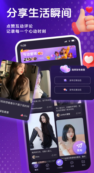 1、为用户搭建高活跃交友场景,让新鲜缘分随时可遇,动态互动拉近距离。