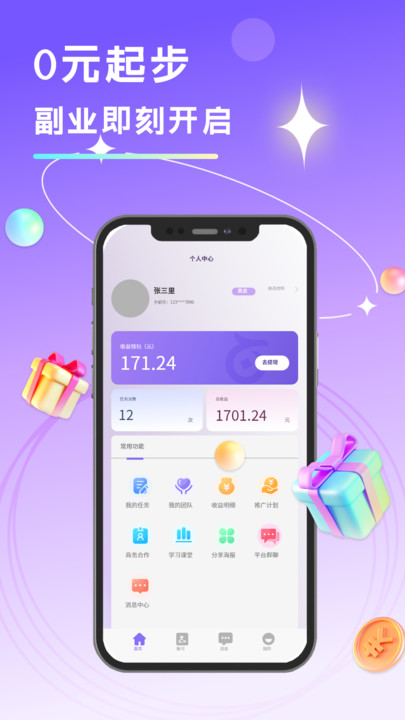 4、在个人中心可随时查看任务详情、收益总额及更多明细内容。