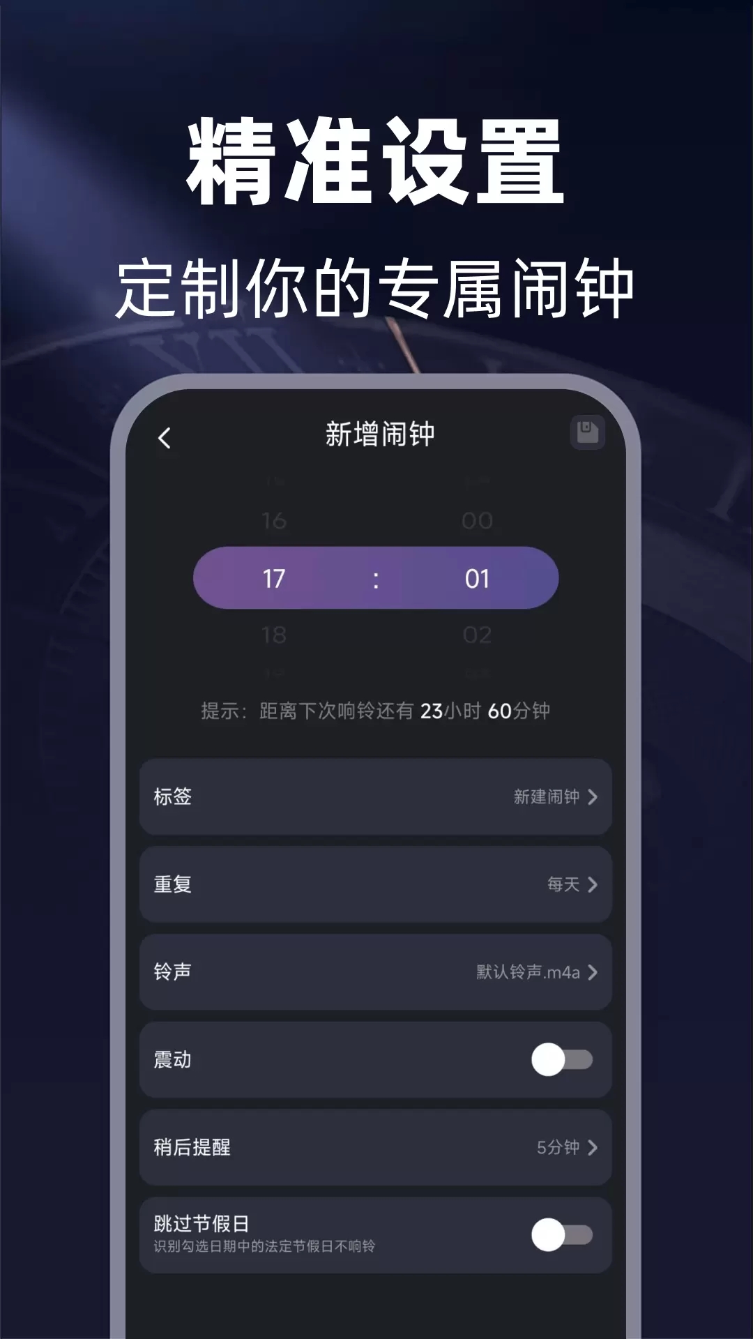 3、智能跳过节假日功能自动同步国家放假安排,周末补眠不再被误伤,同时支持倒班轮休自定义,省去频繁开关闹钟的琐碎步骤,一次设置长期省心。