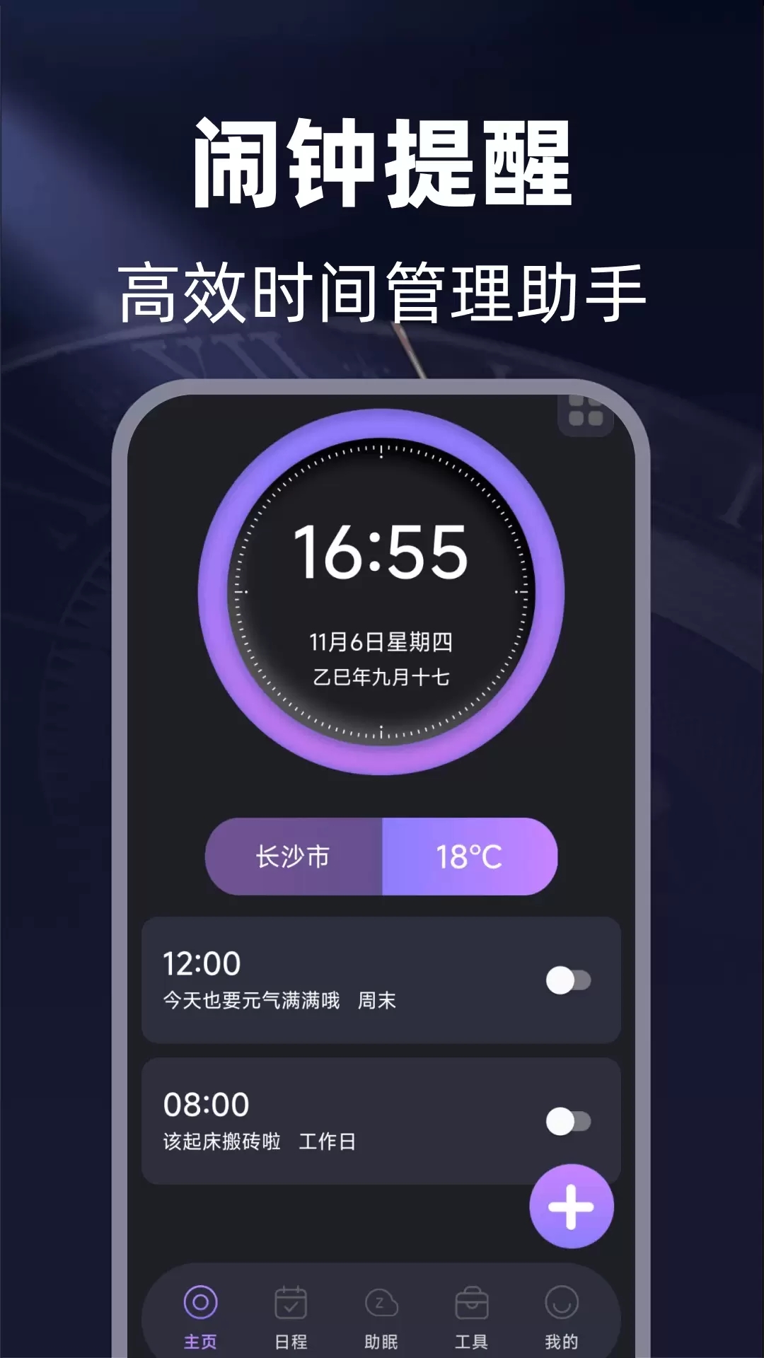 2、进入首页可以看到丰富的功能,实时设置专属闹钟。