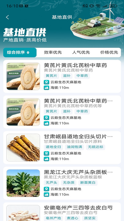 3、进入到【基地直供】,可以看到附近中药基地的中草药。