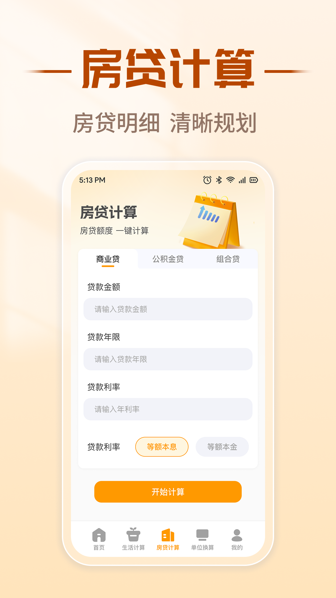 1、专业房贷计算器,支持商贷、公积金、组合贷,输入金额利率,月供、总利息一键算清。