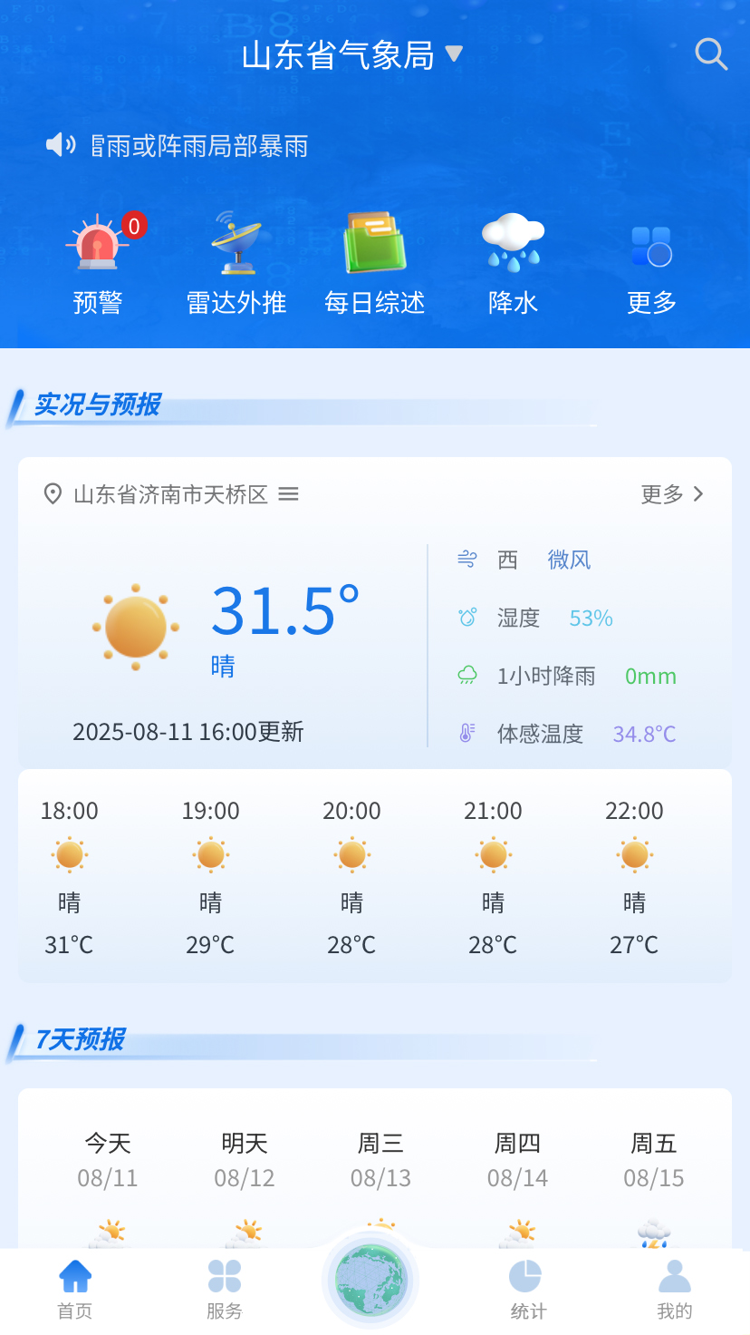 1、在本站下载官方的齐鲁风云app,安装好打开就直接是天气预报界面。