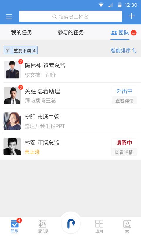 1、构建组织架构与团队通讯录,支持GPS加WIFI双重打卡与智能排班,考勤数据一键导出,多终端协同办公打破时空限制,员工可自定义工作台,任务智能排序减少无效忙碌。