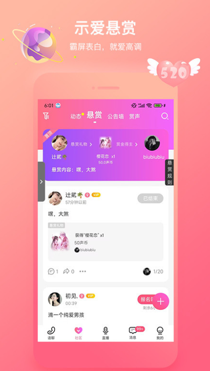 声控语音交友app是一款真实有效的线上异性互动交友软件,每天都会有来自不同地区的单身用户随时在线汇集,任你及时关注对方的信息资料,及时来这配对交友,交友的过程中不需要等待,遇到了喜欢的就可以直接在线聊,聊天话题也是比较多的,你还可以直接在线表白,让你足不出户就可以轻松脱单成功,实现了交友自由。