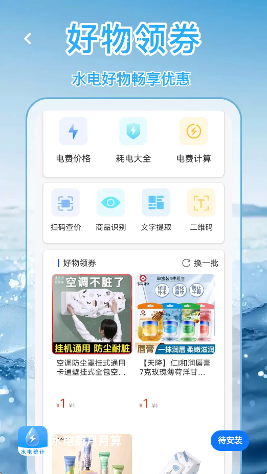 水电费月月算app是一款高效计算水电费用的软件,集生活智慧与便捷服务一体的超实用生活工具,以水电费用的精准计算为核心,融合了水电费记录图表展示、生活好物领券优惠,以及生活常见物品智能识别等多元功能,全方位聚焦与日常生活紧密相连的各类需求,尤其是水电相关领域的实用好物,特别为用户打造了丰富的领券通道,让生活省钱又省心。