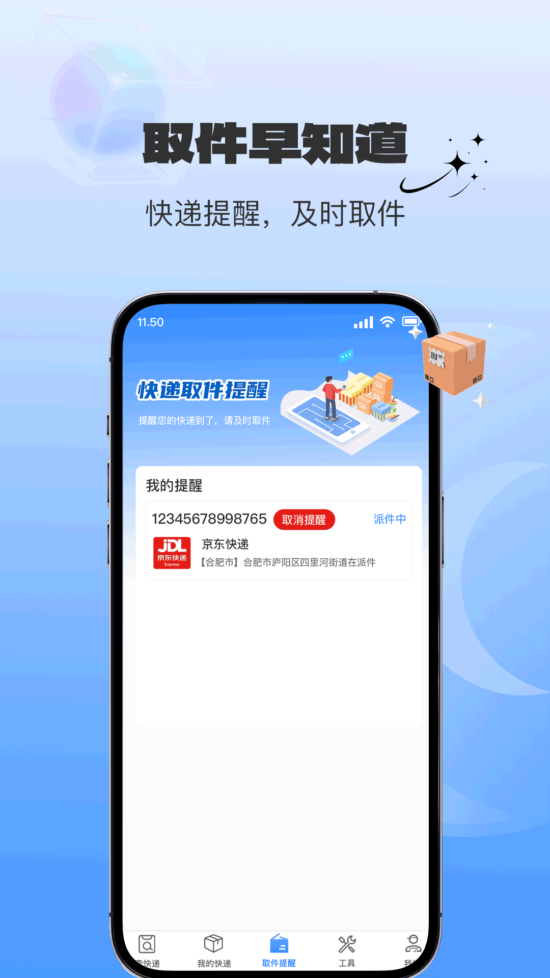 4、设置提醒,取件无忧,在取件提醒板块设定取件时间,app将准时提醒,确保您不会错过任何一个包裹的收取。